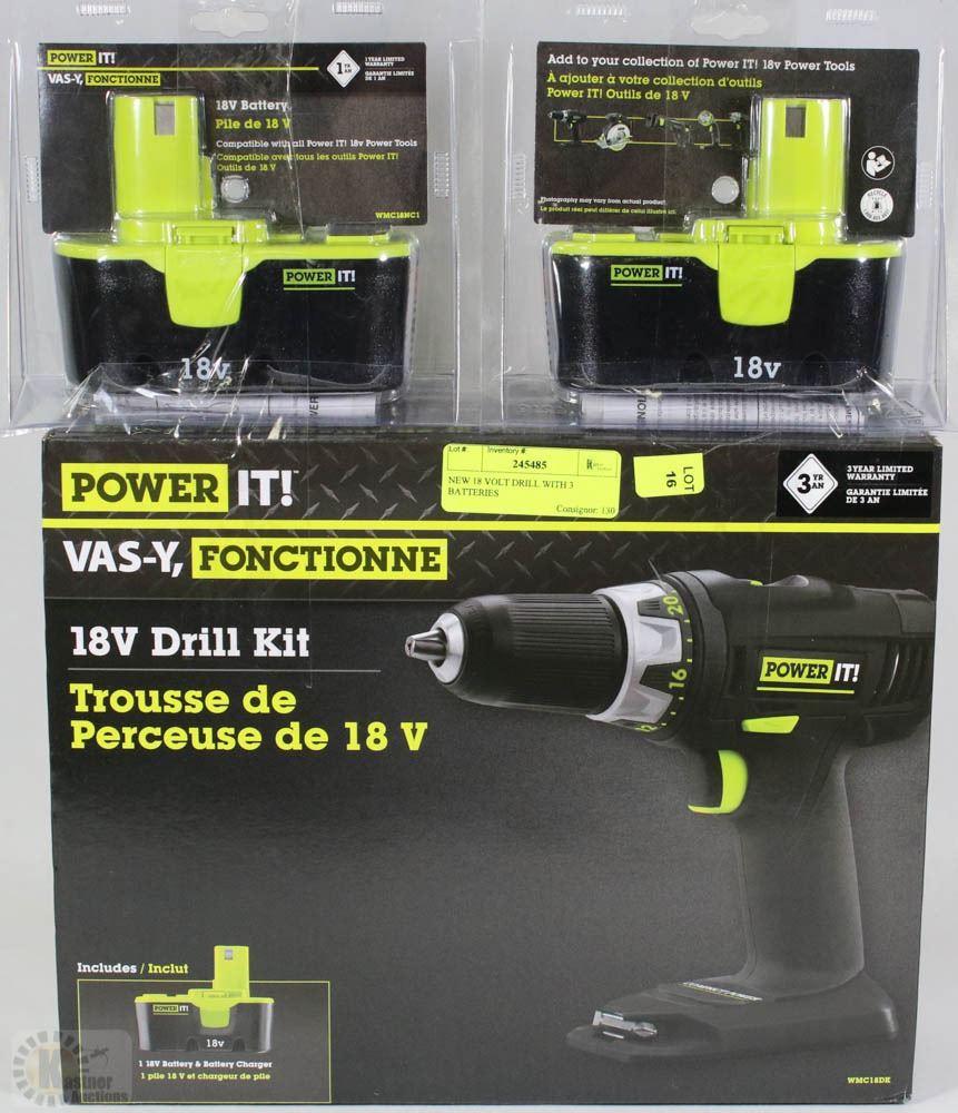 NEW POWER IT 18 VOLT DRILL WITH 3 BATTERIES