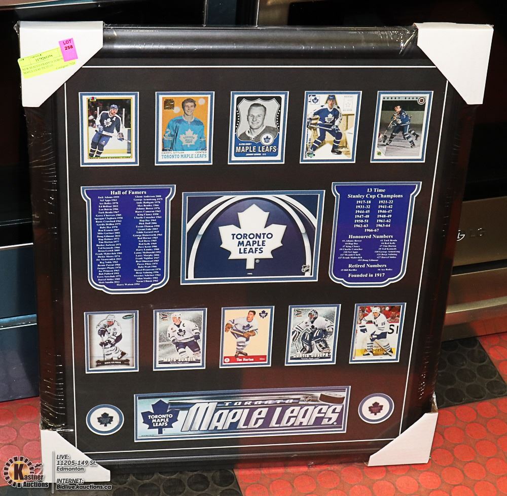FRAMED 10 TORONTO LEAFS HOCKEY CARDS INCLUDING TIM HORTON,SUNDIN,GILMOUR,JOHNNY BOWER AND 6 MORE STARS,HALL OF FAMERS LIST,NHL AWARDS STATS ,23X 26 ,SEALED COLLECTIBLE,NHL PINS-COLLECTIBLES