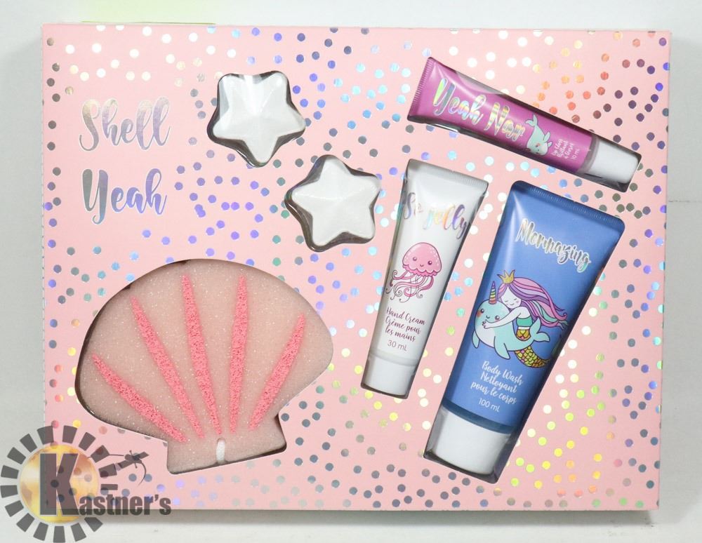 INCLUDES: BODY WASH, HAND CREAM, LIP GLOSS, TWO BATH FIZZERS, AND SHELL SHAPE SCRUBBER. WELLNESS