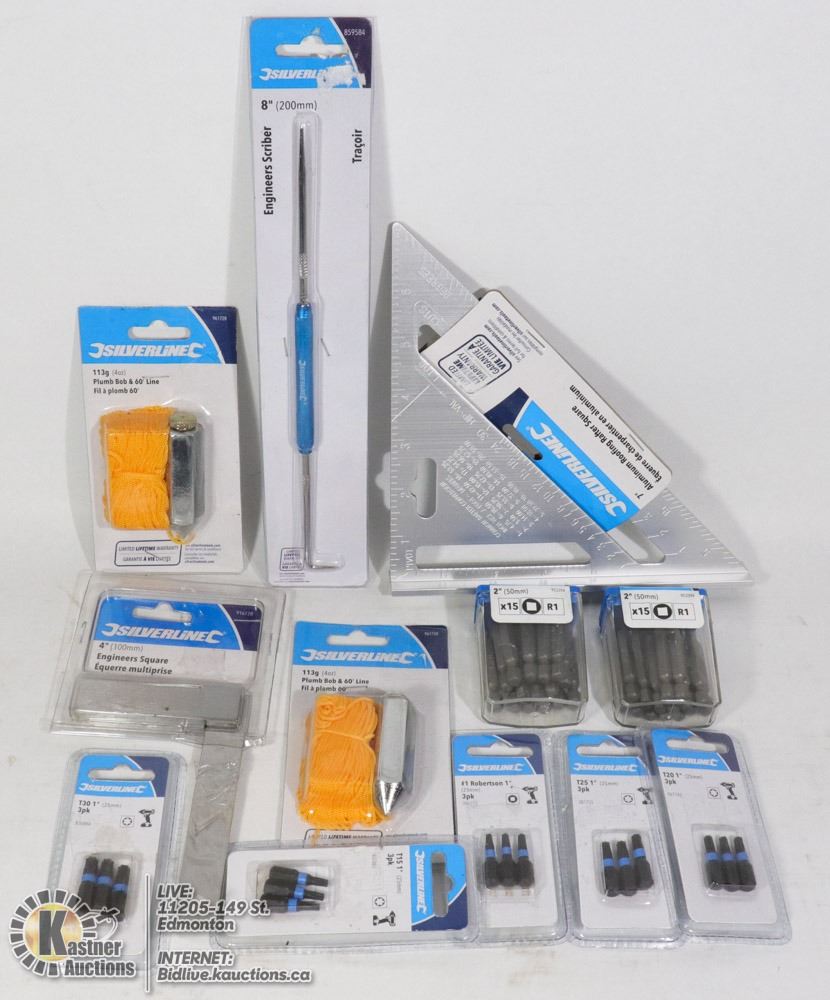 OF DRILL BITS 5 PACK'S OF 3 1" DIFFERENT SIZES, 2 PLUMB BOBS 60 LINE, 2 PACKS OF 2" X 15 DRILL BITS & 7' ALUMINUM ROOFING SQUARE & MORE. TOOLS