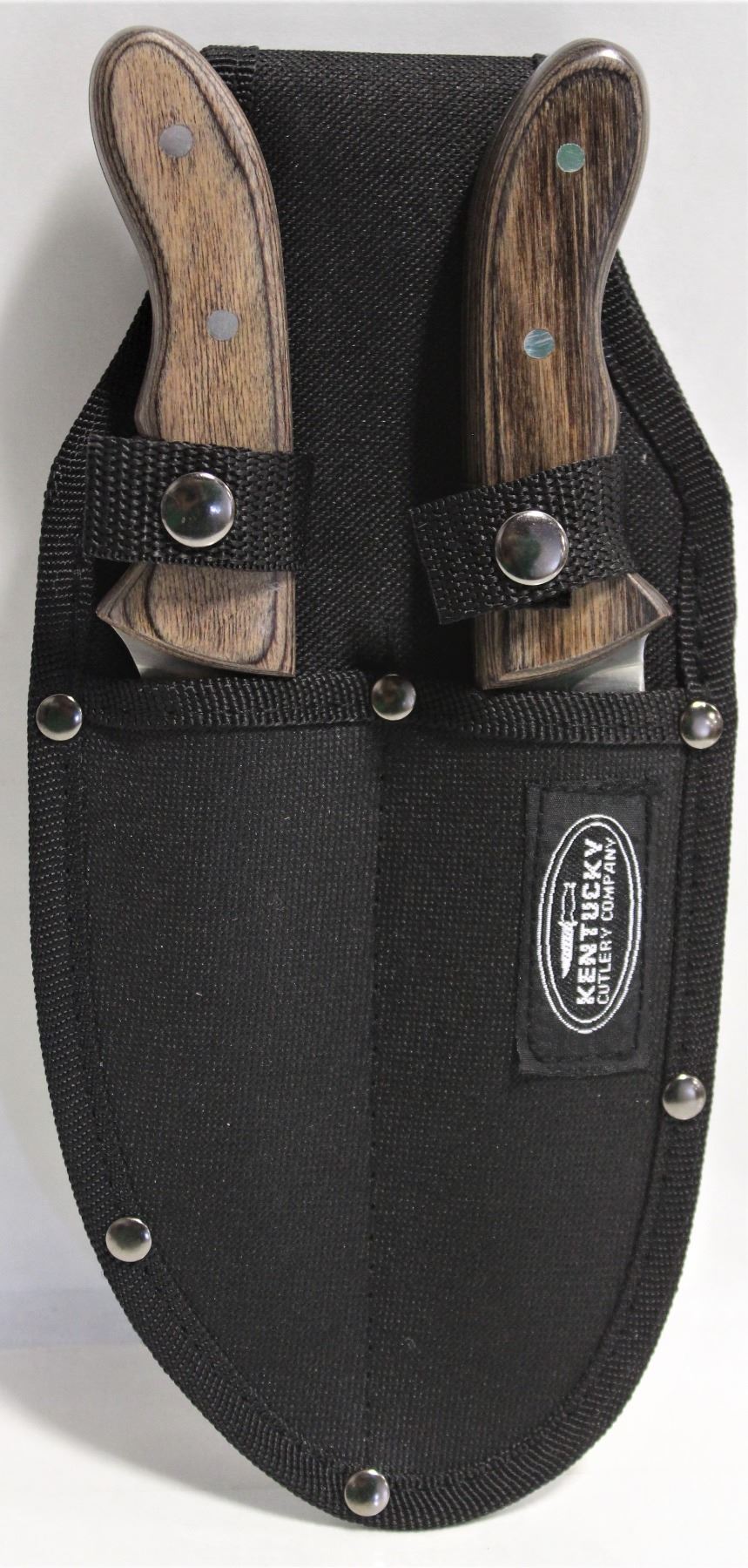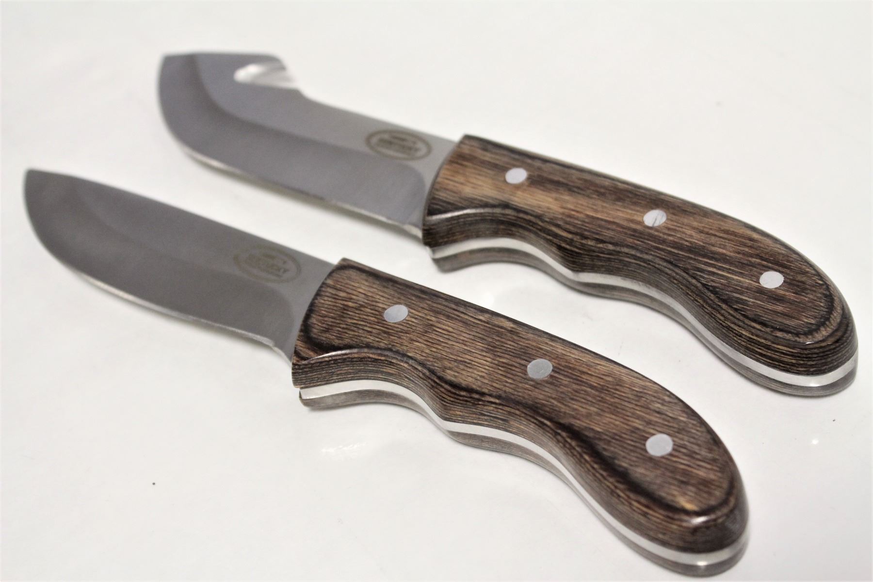 440 STAINLESS STEEL, FULL TANG BLADE W/ SATIN FINISH. HIGH-END COMPOSITE PAKKAWOOD HANDLE (DENSE & MOISTURE-RESISTANT). INCLUDES GUTTING KNIFE & SKINNING KNIFE. BY KENTUCKY CUTLERY COMPANY.