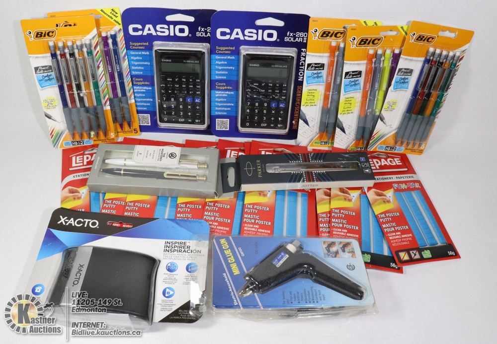 POSTER PUTTY PACKETS, 5 PACKS OF 5 MECHANICAL PENCILS, C-ACRO OPERATED PENCIL SHARPENER, PENS, MINI GLUE GUN & MORE.