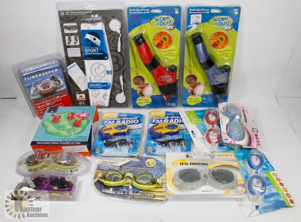 TEK" TUBE KEEPER #TB-101, 8 PAIR OF VARIETY OF FAMILY SWIM GOGGLES, 2 WATER PROOF RADIOS, INFLATABLE DRINK HOLDER. SEASONAL