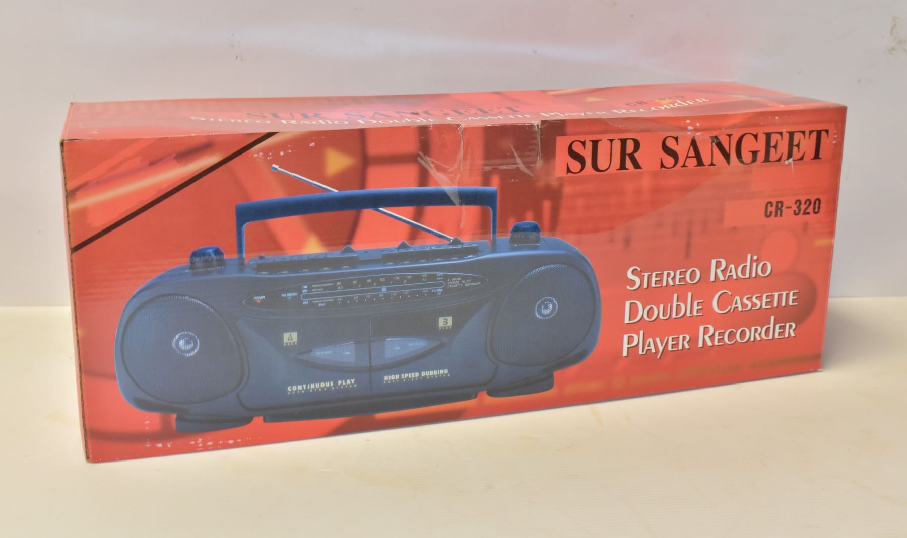NEW IN BOX. M# CR-320, CAPABLE OF STEREO, RADIO, DOUBLE CASSETTE PLAYER RECORDER. AM/FM 2 BRAND RADIO, FM STEREO INDICATOR, SOFT EJECT DOOR, AUTO STOP RECORDER, HEADPHONE JACK, BUILT IN CONDENSER MICROPHONE , AC/DC OPERATION, CHROME KNOBS (OPTIONAL). POWER SOURCE: 9V DC CORD, OR SIX UM-1/D-SIZE/R20(BATTERIES NOT INCLUDED)