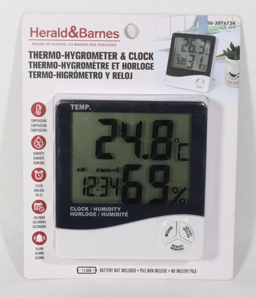 MEASURES TEMPERATURE, HUMIDITY. WITH BUILT IN CLOCK, CALENDAR, AND ALARM. HOME