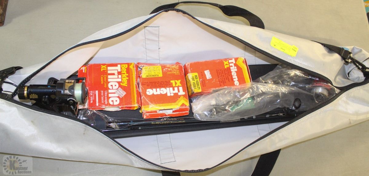 BRONCO ROD+REEL WITH 4 EXTRA TRILENE XL FISHING LINE SPOOLS IN ORIGINAL BOXES - ALL COME IN CARRY CASE EITH SHOULDER STRAP