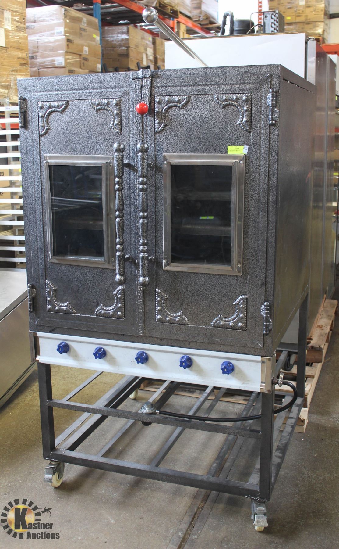 ON CASTORS (ONE BROKEN) W/ LOWER COOLING RACK, GAS BARB CONNECTION., 4 ADJUSTABLE SHELVES.