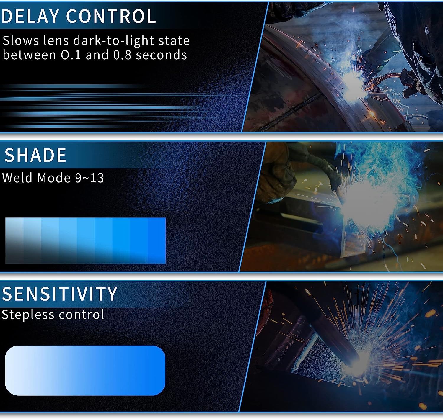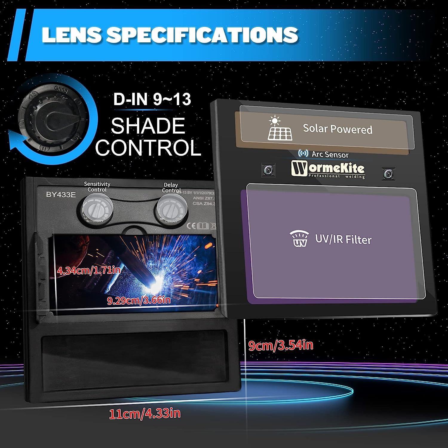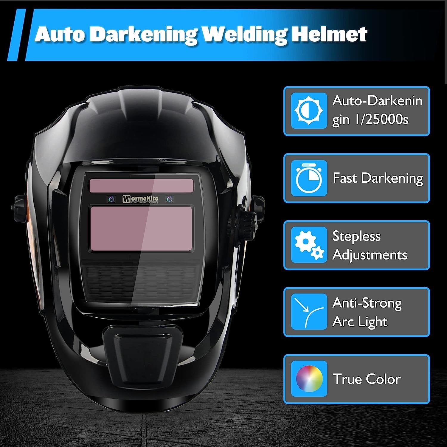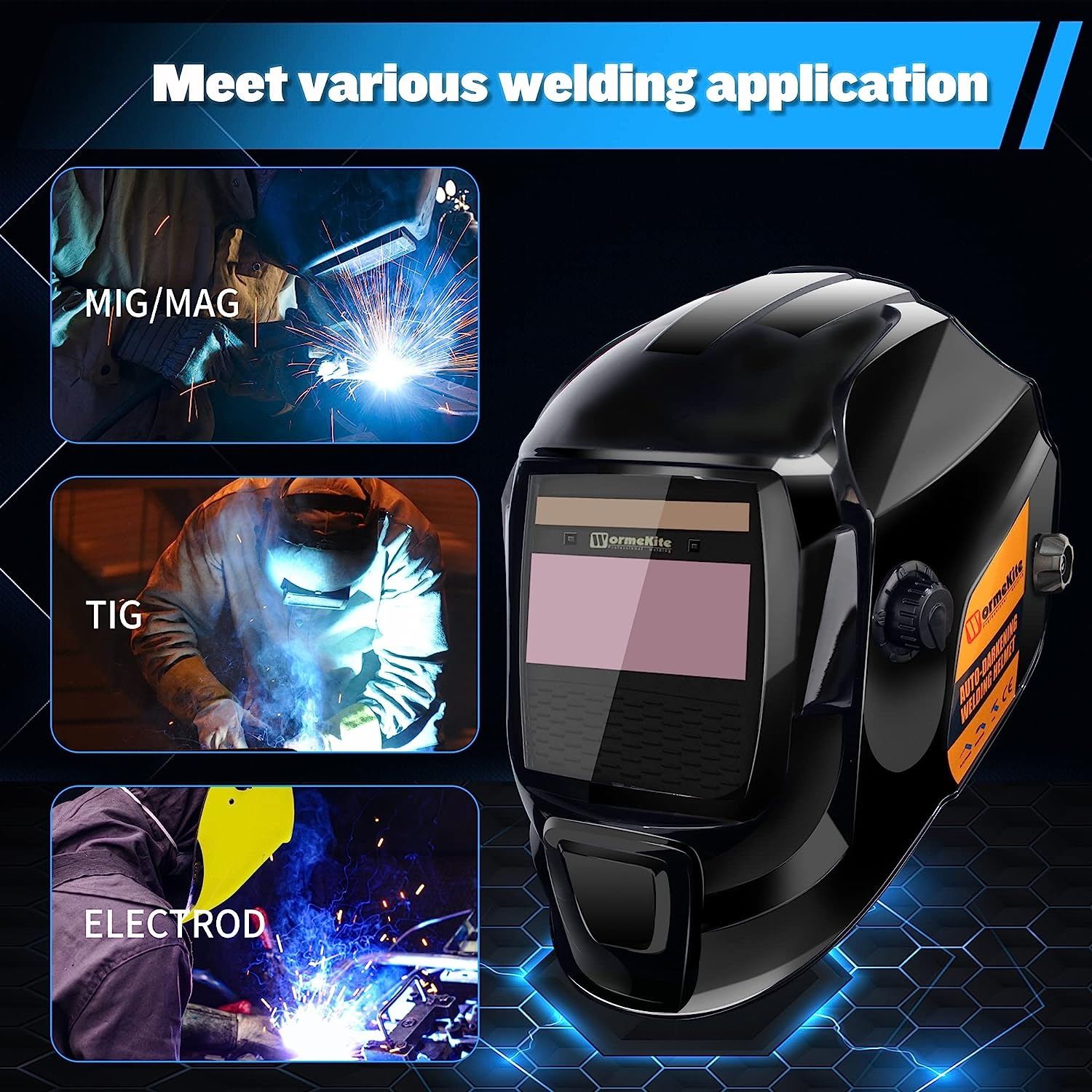HELMET, SOLAR POWERED AUTO DARKENING, WIDE SHAD, 4/9 - 13 FOR TIG/MIG/MAG/MMA/ARC, HOOD AND MASK, AMZ SES, AMZ MSRP. $89.99