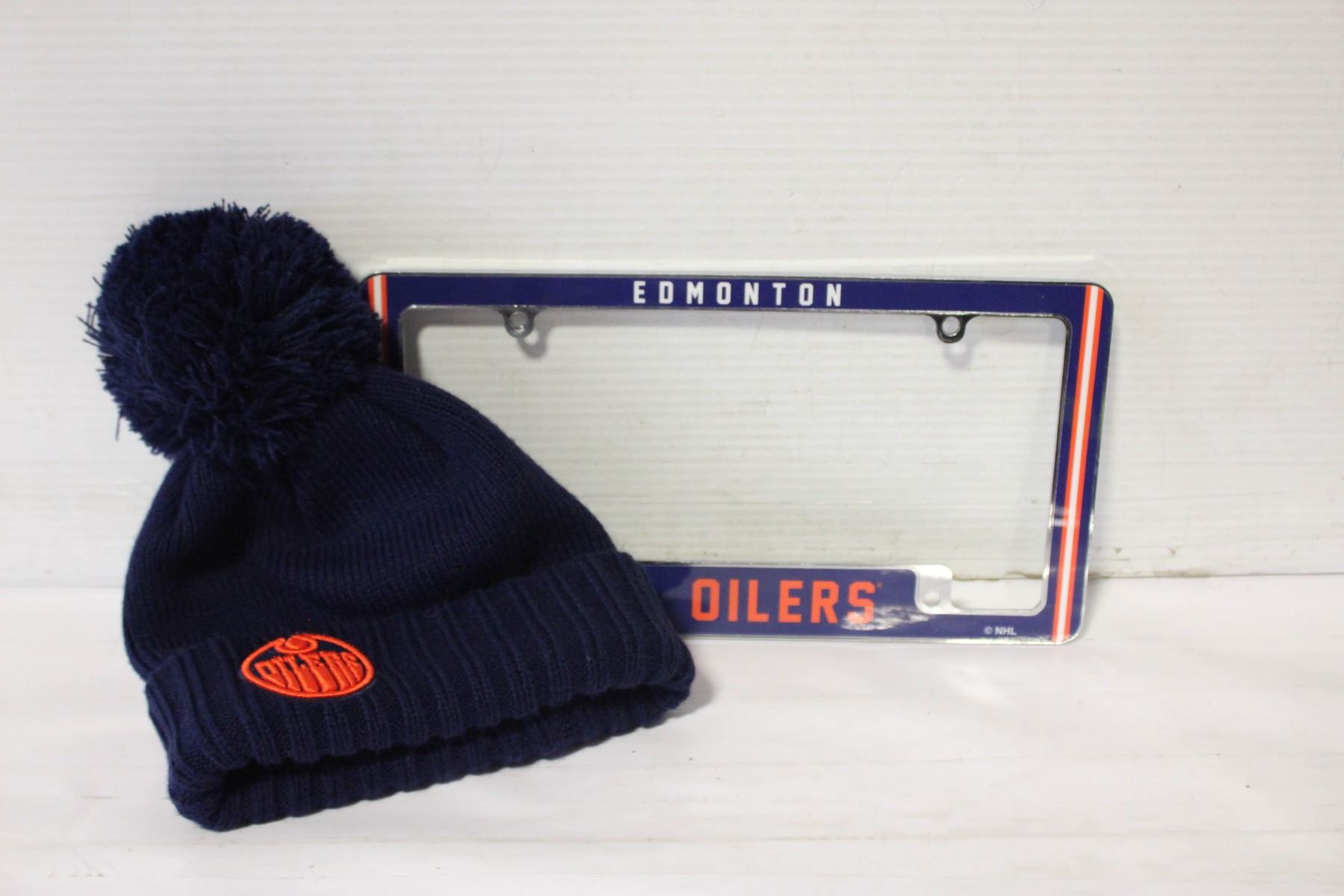 NHL OILERS TOQUE AND LICENSE PLATE HOLDER