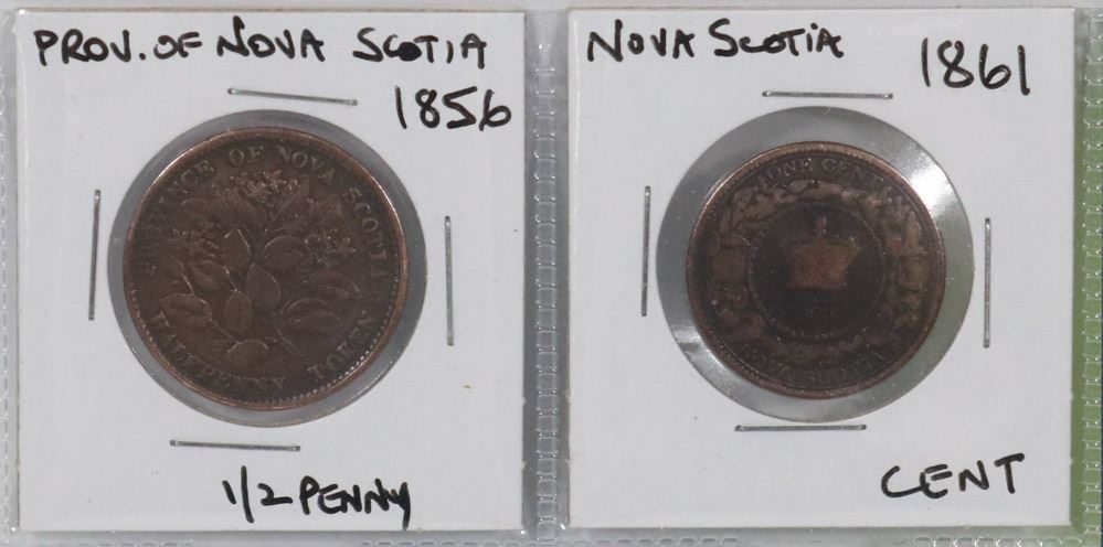 PROVINCE OF NOVA SCOTIA 1856 1/2 PENNY; NOVA SCOTIA 1861 ONE CENT . CURRENCY.
