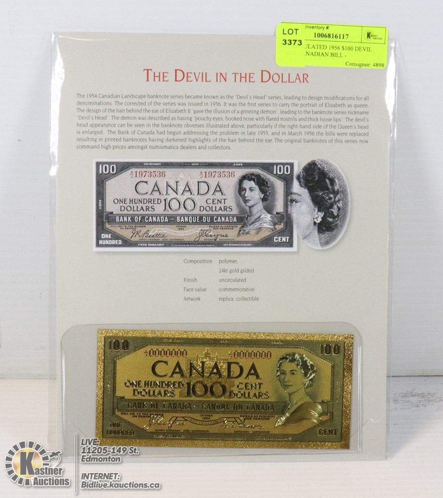 POLYMER 24 KT GOLD GILDED DEVIL FACE $100 DOLLAR, UNCIRCULATED. NOVELTY BILL, NOT LEGAL TENDER