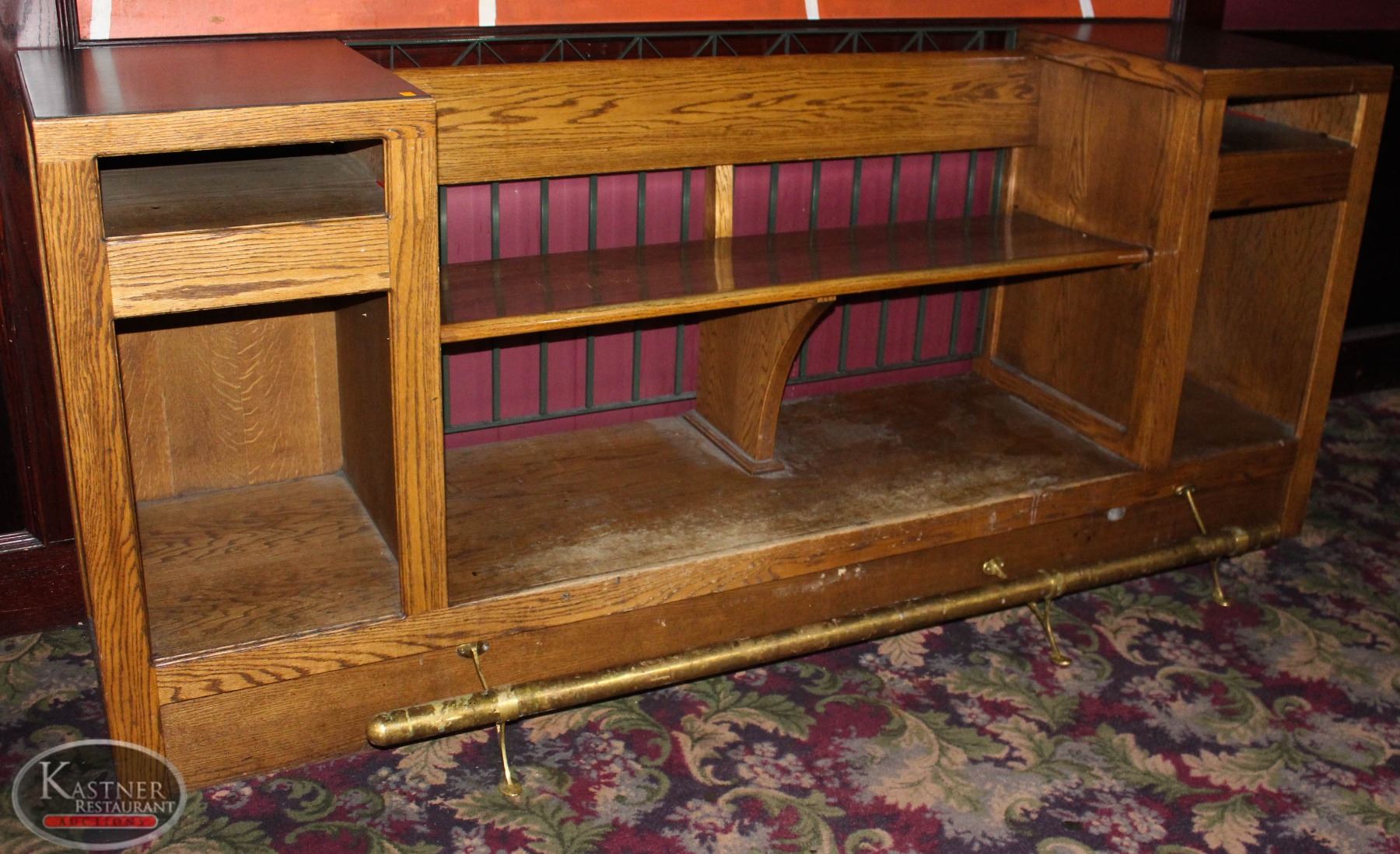 OAK SEATING BENCH W/ BRASS FOOTRAIL.