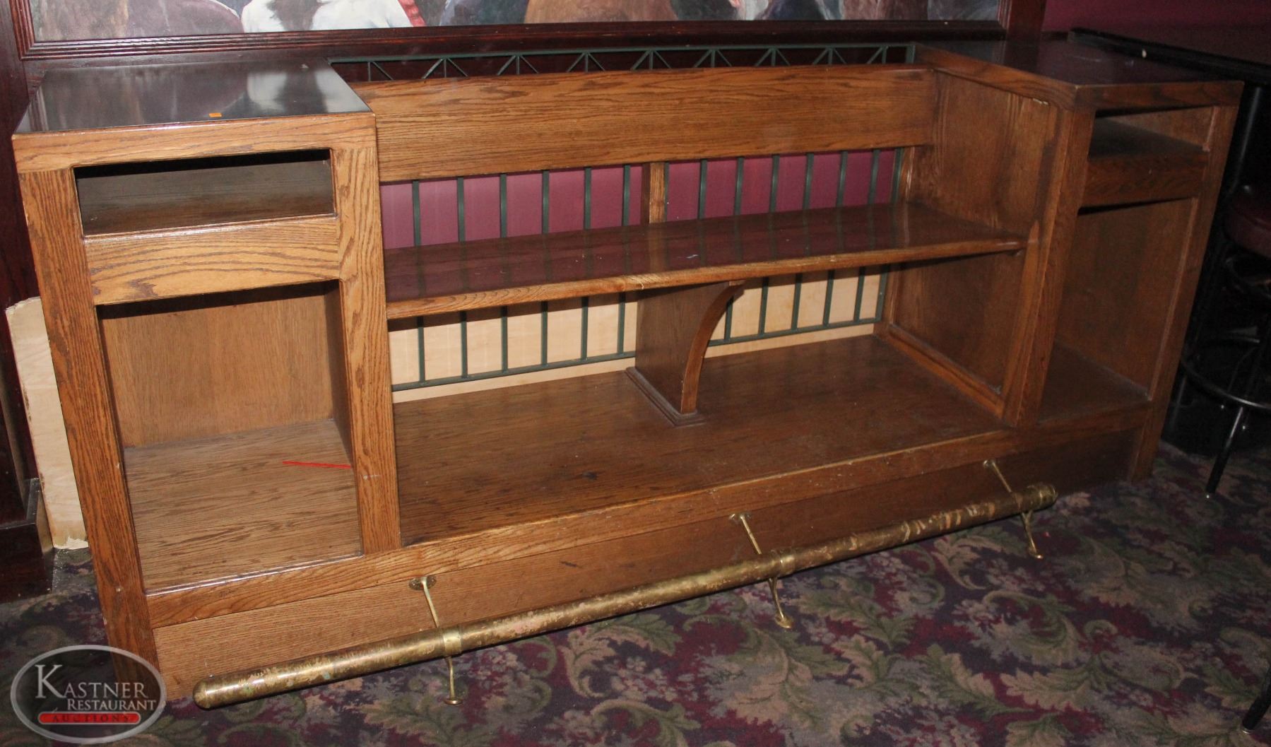 OAK SEATING BENCH WITH BRASS FOOTRAIL.