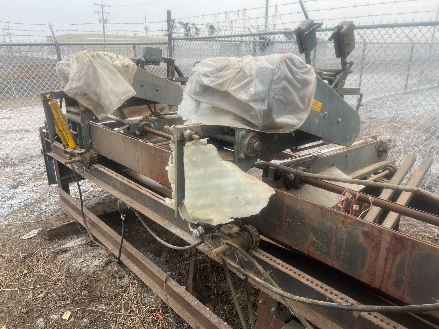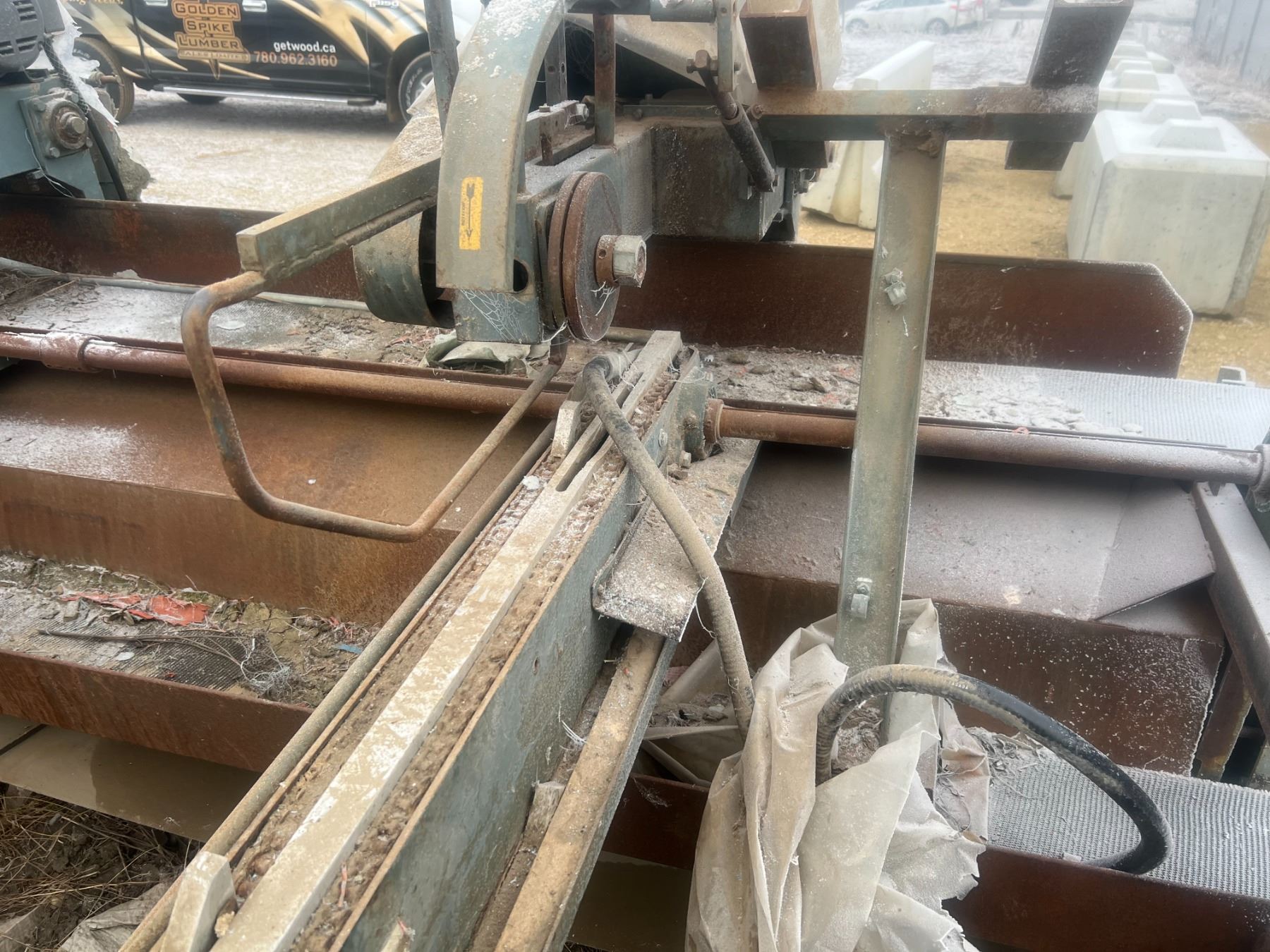 WELDED HEAVY DUTY 6" CHANNEL AND ANGLE IRON CONSTRUCTION, OVERHEAD SAW UNITS WITH V BELT DRIVE, 5 HEADS ON UNIT, BLADES REMOVED BUT INCLUDED IN LOT, NEEDS NEW CHAINS/PULLIES, CUSTOMER IS RESPONSIBLE FOR REMOVAL OF ASSETS (FORKLIFT IS AVAILABLE ON SITE) UNIT WAS REMOVED FROM FLEET WHILE STILL FUNCTIONAL, HAS BEEN SITTING FOR 10 YEARS.