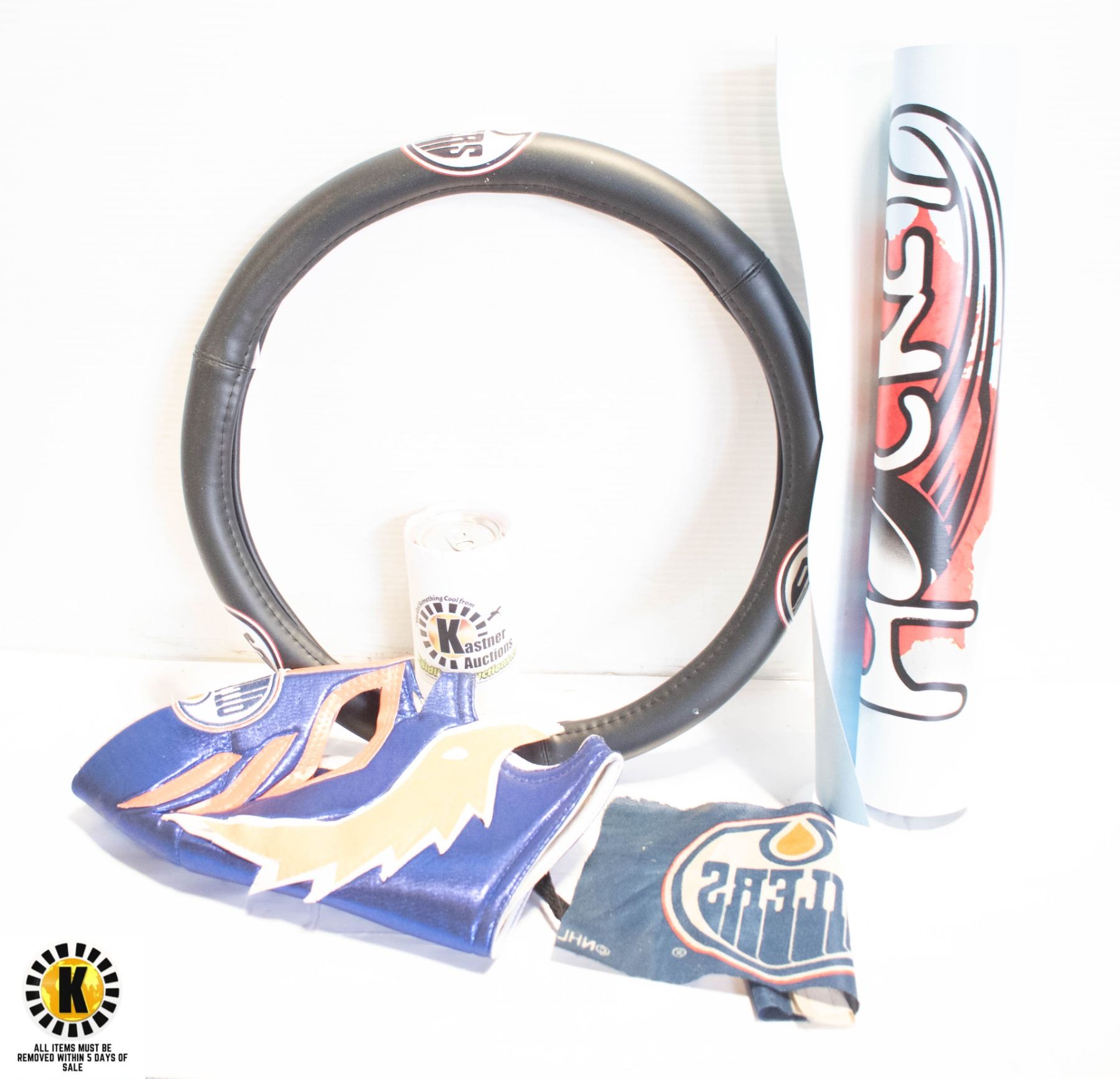 OILERS LOT WITH 6 FOOT MOLSON CANADIAN BANNER + WRESTLING MASK + FLAG + WHEEL COVER