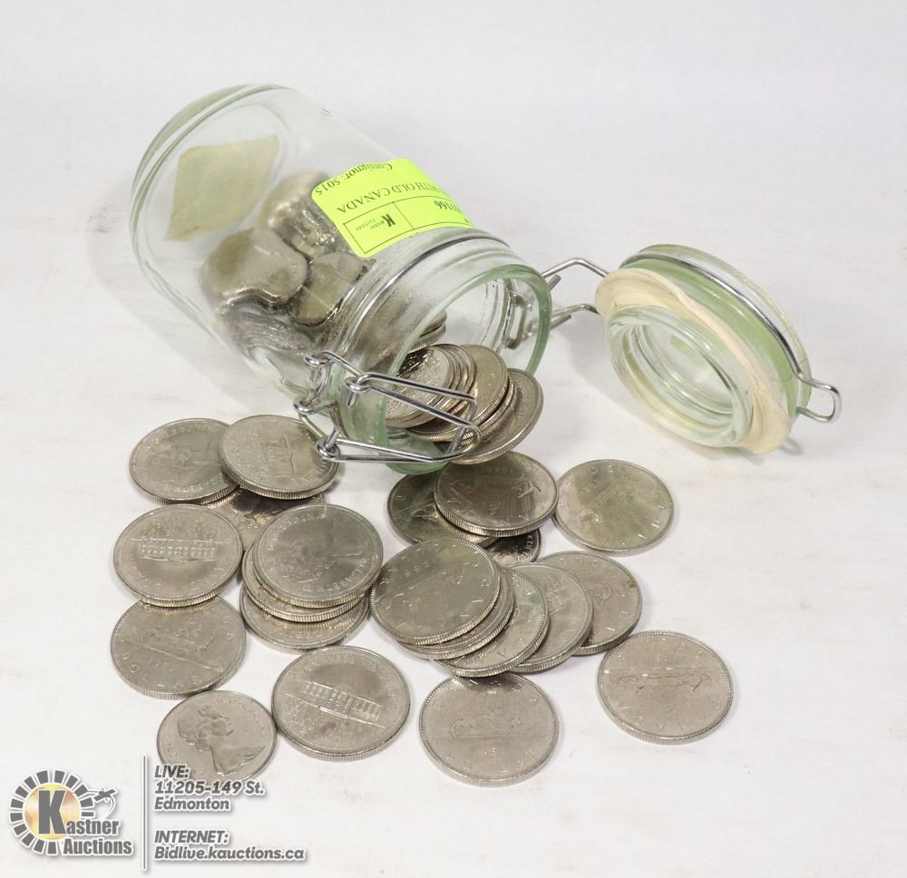 OLD JAR FILLED WITH OLD CANADA $1 & 50 CENTS COINS