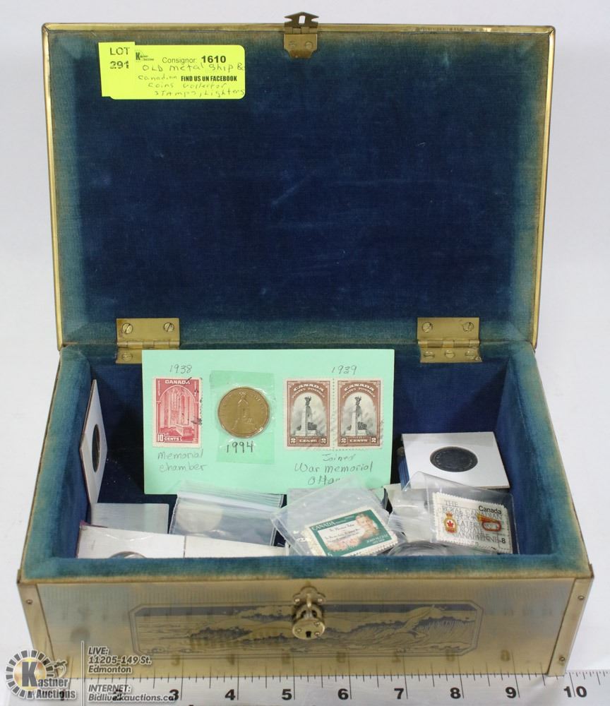 OLD METAL SHIP BOX WITH CANADIAN COINS, COLLECTOR