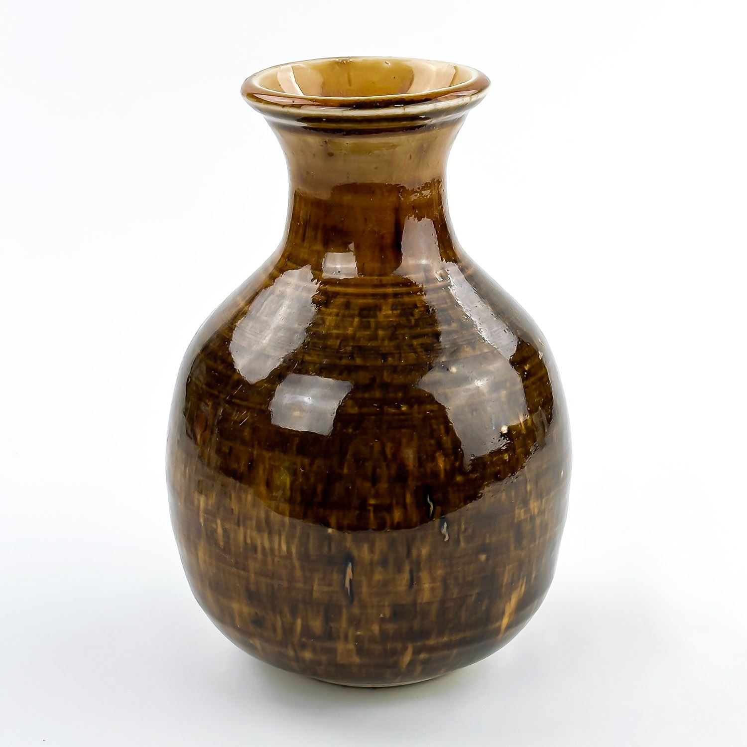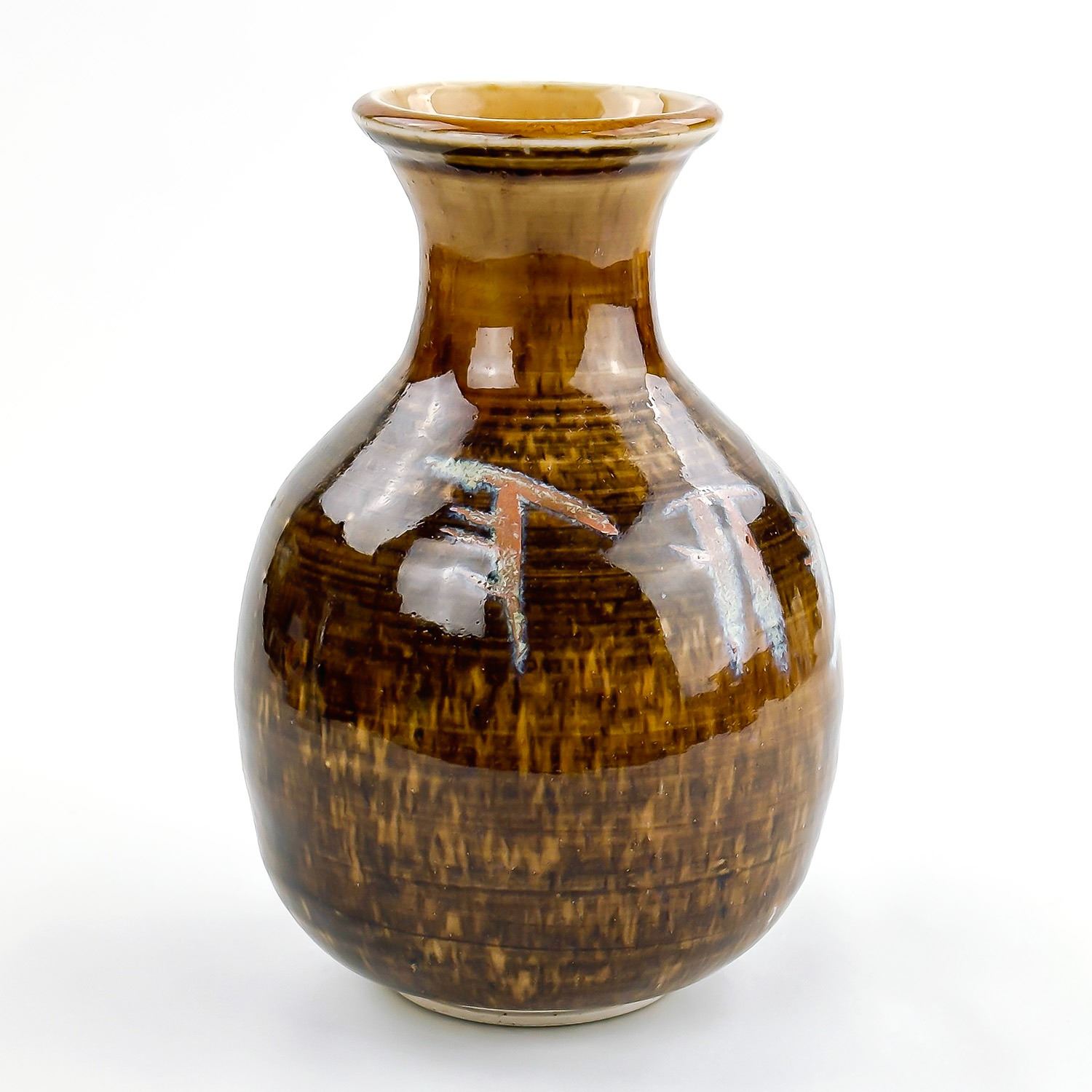 #8192 - VINTAGE SIGNED GLAZED STONEWARE POTTERY VASE. VASE APPEARS TO HAVE 3 LETTER SYMBOLS ON THE OUTSIDE - IT IS SIGNED ON BOTTOM - TAE GALLERY P. MANSEN? - UNSURE OF EXACT NAME. MEASURES: 6 5/8” (17 CM) TALL BY 4.5” (11.5 CM) WIDEST DIAMETER