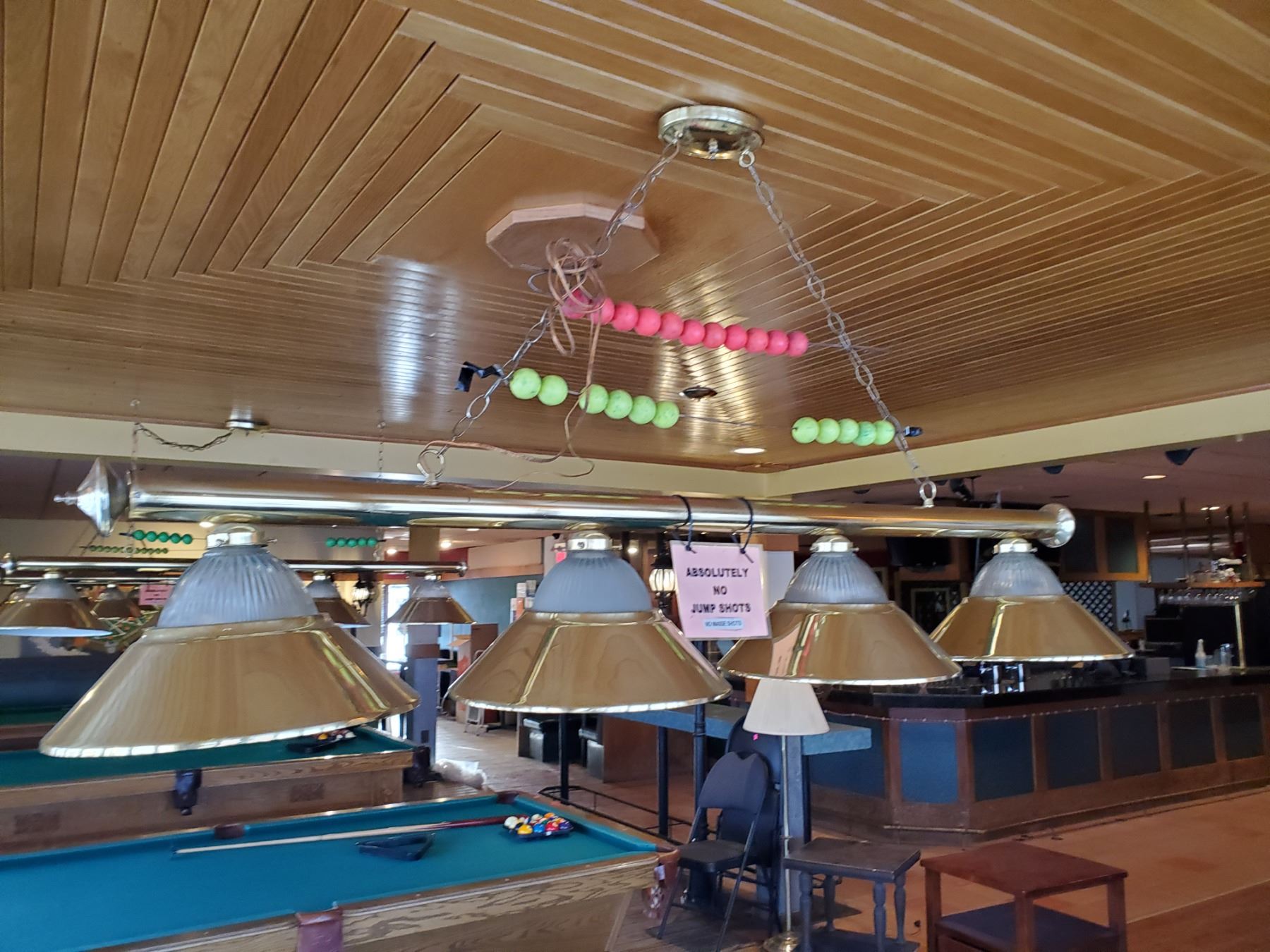 RACK, EXTENSION CUE AND 4 PENDANT HANGING POOL TABLE LAMP. REMOVAL IS THE RESPONSIBILITY OF THE BUYER