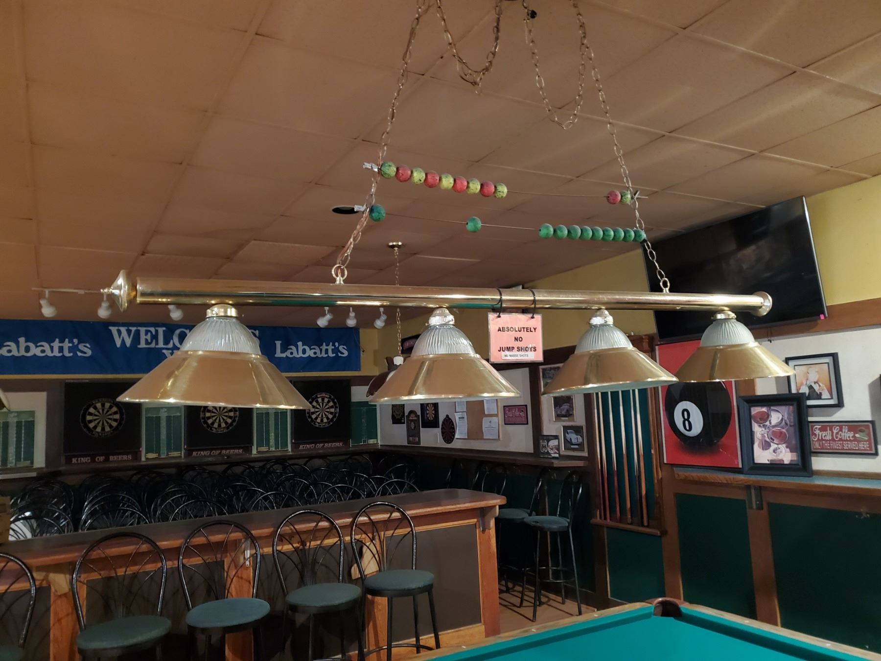 RACK, EXTENSION CUE AND 4 PENDANT HANGING POOL TABLE LAMP. REMOVAL IS THE RESPONSIBILITY OF THE BUYER