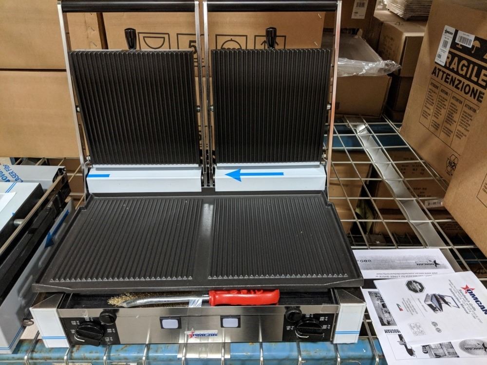 NEW - ELITE SERIES DOUBLE GROOVED SURFACE PANINI GRILL, MADE IN ITALY, OVERALL DIMS 12.75” X 21” X 19.75”H (OPEN) 7"H (CLOSED), GRILL SURFACE 10" X 19", OMCAN 11378