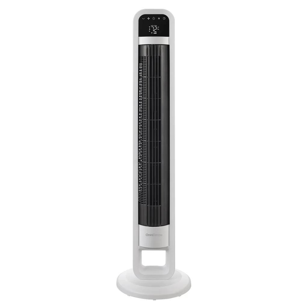 OMNIBREEZE DIGITAL WHITE TOWER FAN WITH REMOTE CONTROL, FOUR SPEEDS AND ADJUSTABLE BREEZE MODES (SLIGHTLY USED, MISSING REMOTE)