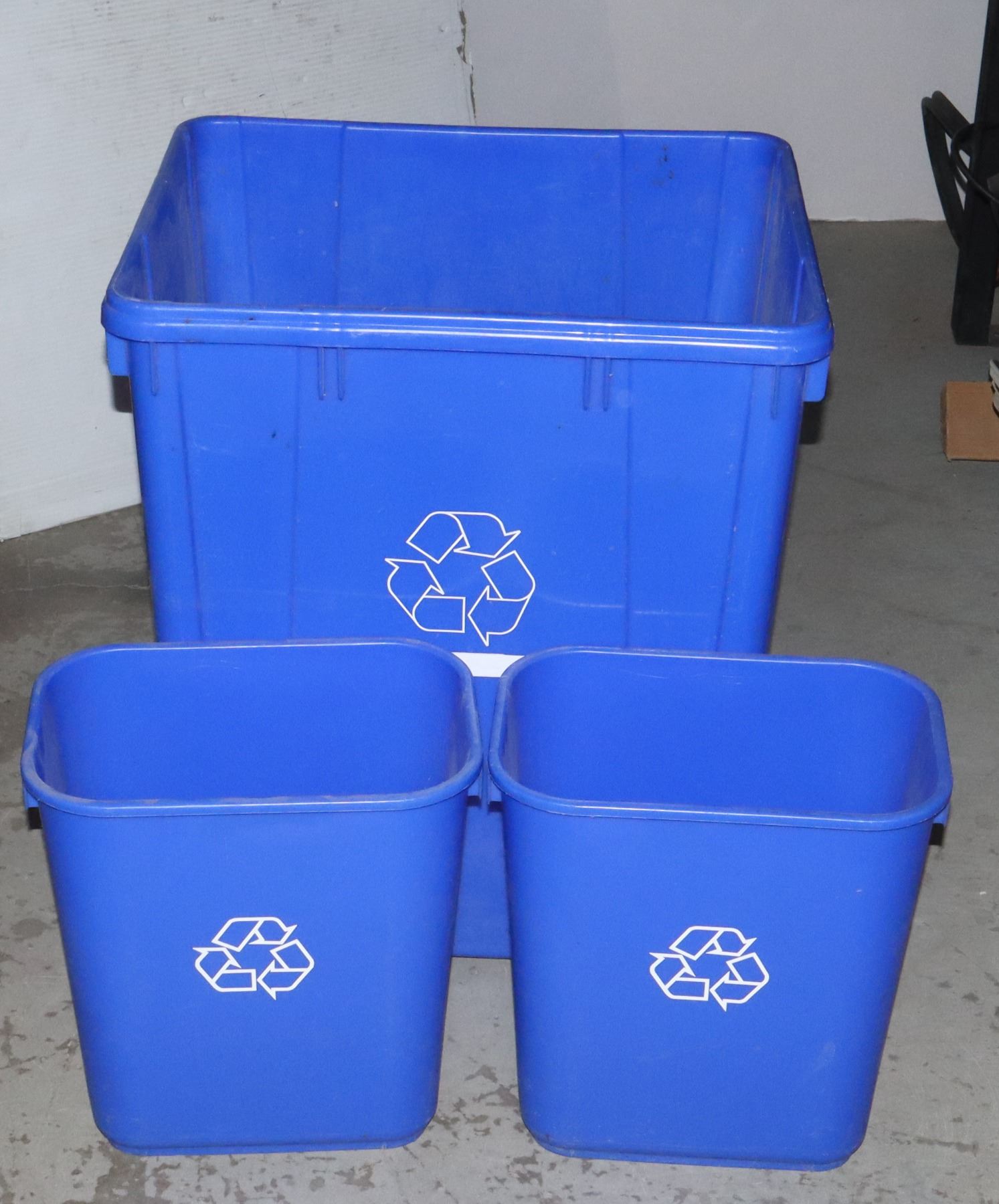 ONE LARGE, TWO SMALL BLUE RECYCLING BINS