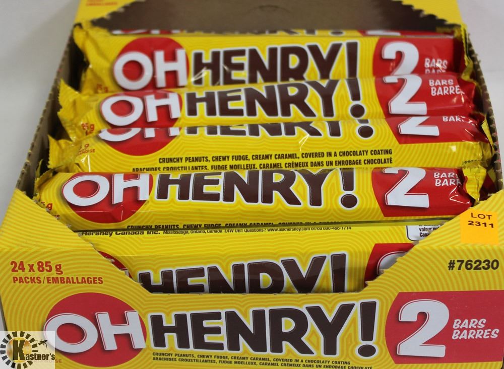 OPEN BOX OF 2PC OH HENRY CHOCOLATE BARS.
