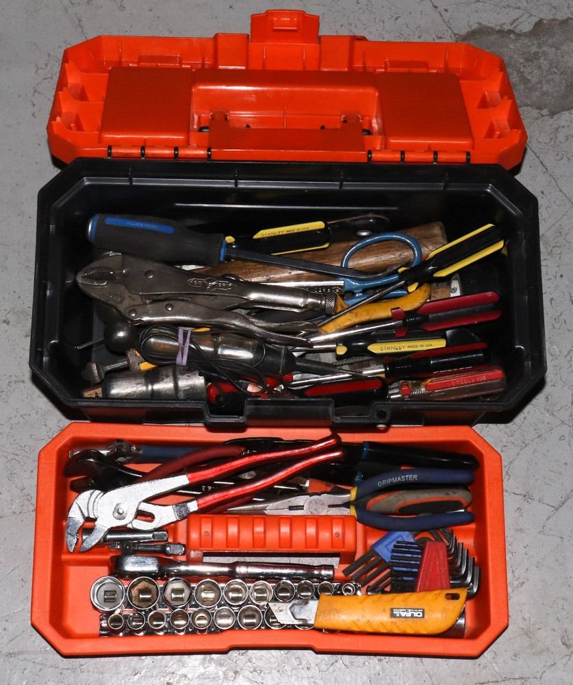 ORANGE AND BLACK TOOL BOX WITH CONTENTS