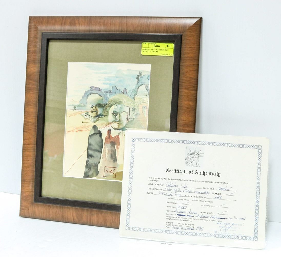 Cutting tools carve an image into a block of wood. The carving creates a relief pattern. That is the uncut part of the wood is printed. The Salvador Dali The Avaricious print required 34 separate woodblocks to create the final woodblock. Printing one woodblock added the color wash laid on the woodblock.