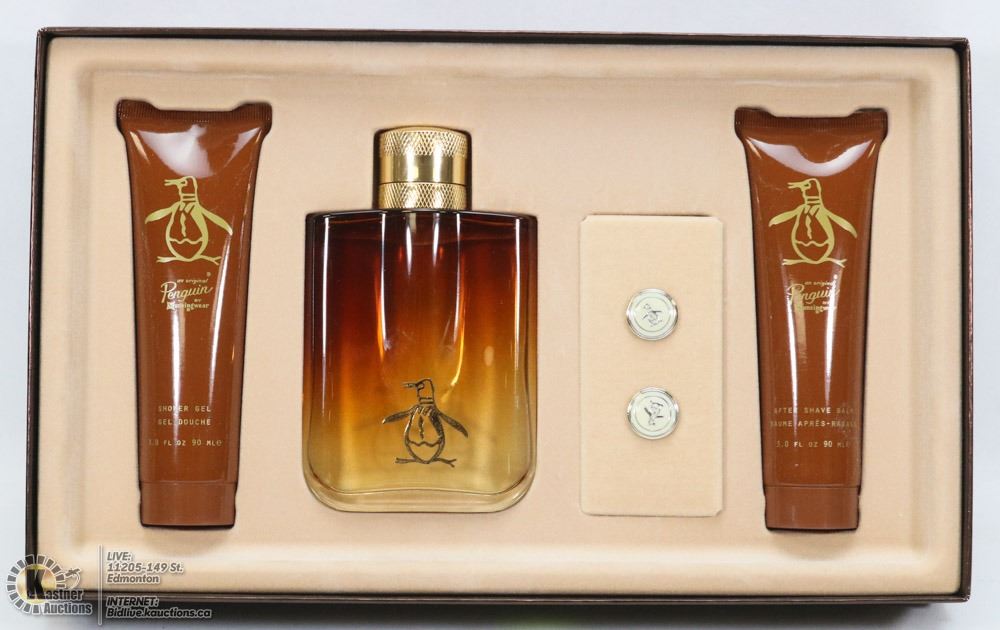 4 PC SET CUFF LINKS, AFTER SHAVE BALM, EAU DE TOILETTE SPRAY, SHOWER GEL. MISC