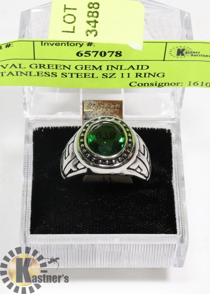 OVAL GREEN GEM INLAID STAINLESS STEEL SZ 11 RING