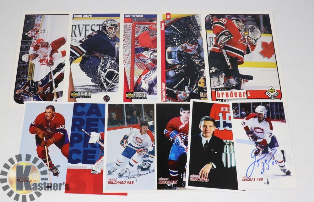 BRODEUR, JOSEPH, FLUERY, THEORDORE) AND MONTREAL CANADIENS AUTOGRAPHED POSTCARD LOT X6 HOULE, GINGRAS, HOULE, BOUCHARD, TALBOT (UNSIGNED), CAREY PRICE (UNSIGNED)