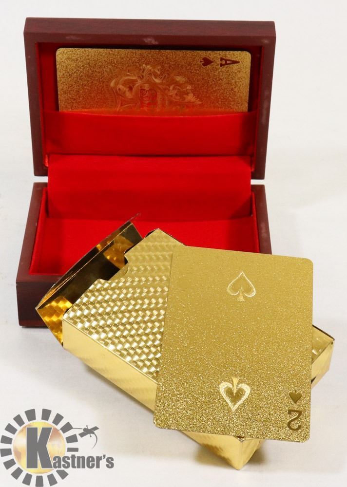 PACK OF GOLD FOIL PLAYING CARDS IN WOOD CASE