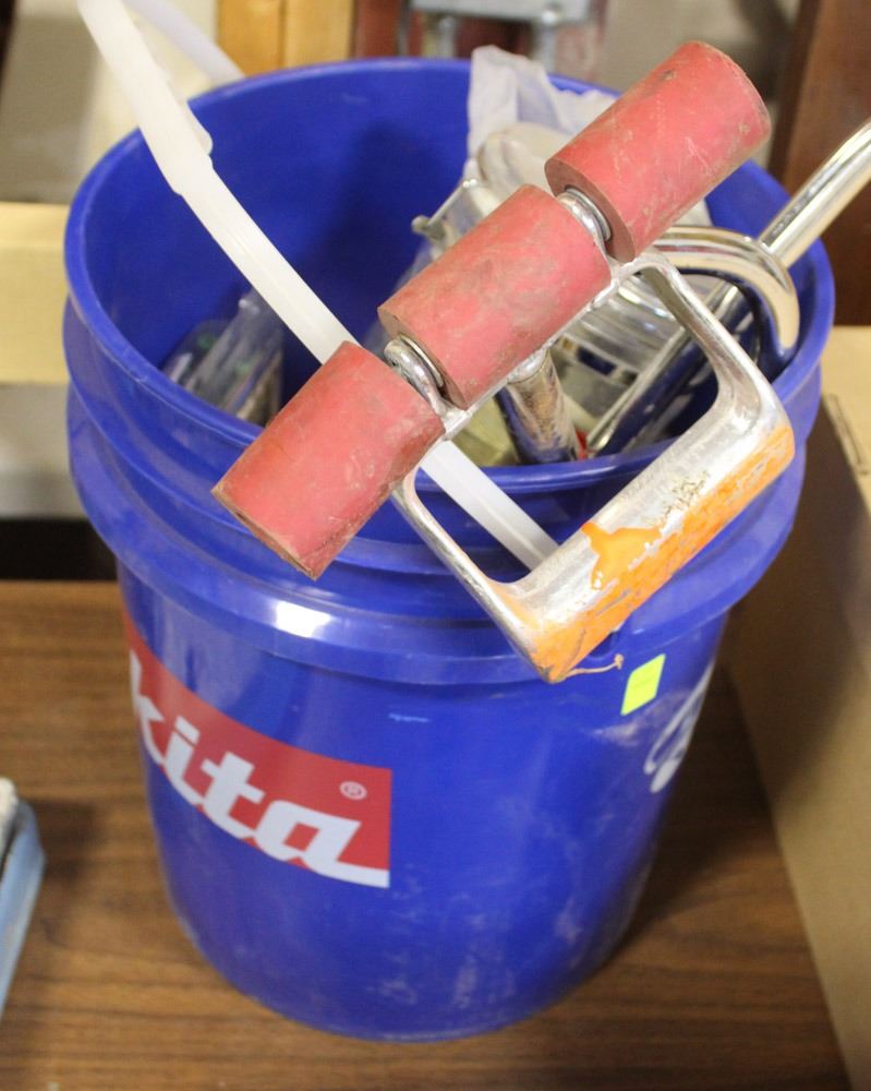 PAIL OF CASTERS, STAPLES, SAWS AND MORE