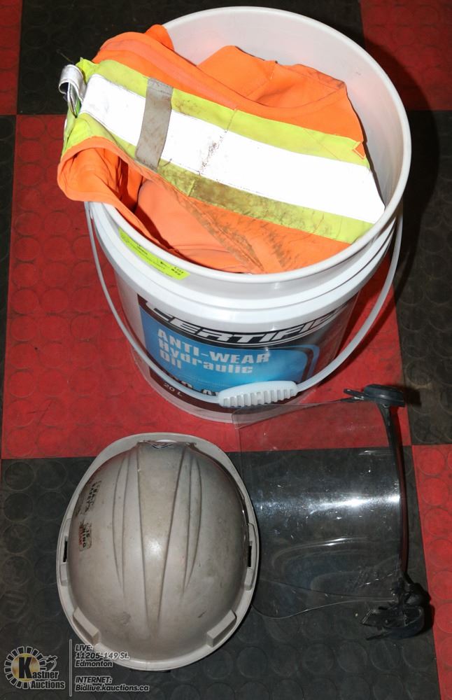 PAIL OF CONSTRUCTION SAFETY GEAR.