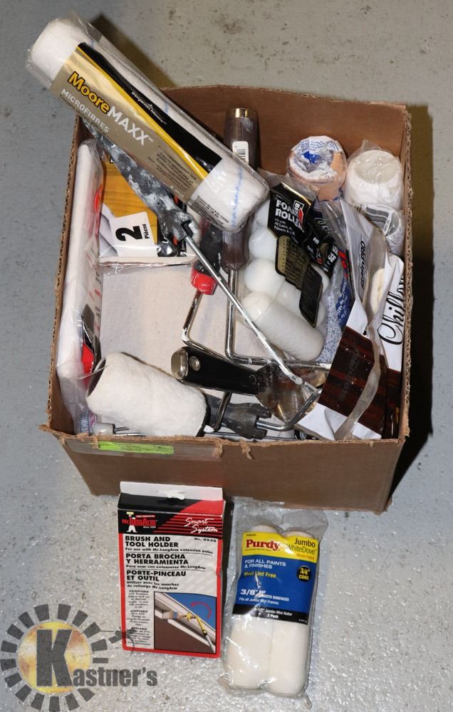 PAINTING TRAYS, ROLLERS, ROLLS, BRUSHES- ASSORTED