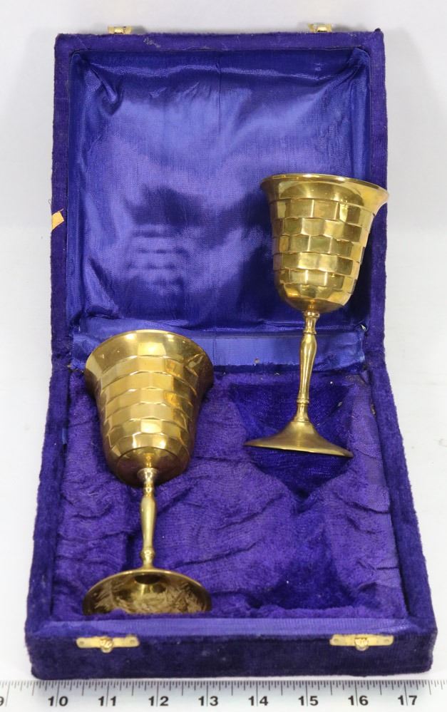 PAIR OF BRASS GOBLETS IN VELVET BOX