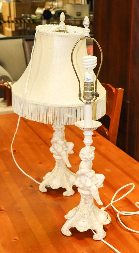 PAIR OF CHERUB LAMPS WITH ONE SHADE