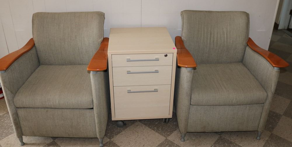 PAIR OF CLUB CHAIRS AND ROLLING 3 DRAWER CABINET
