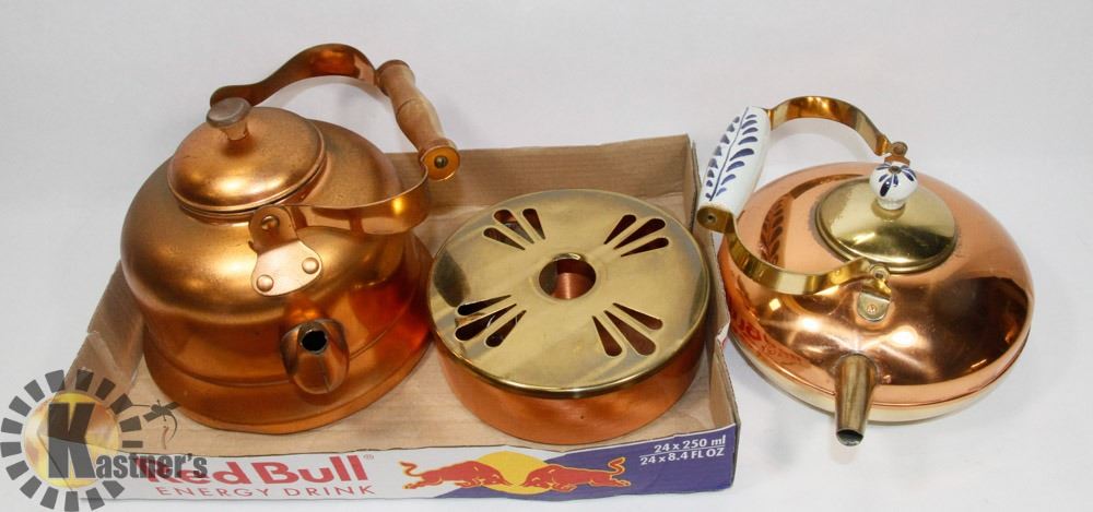 ONE HAS A DELFT HANDLE AND A WARMER POT AND THE OTHER IS A WOODEN HANDLED TEA KETTLE