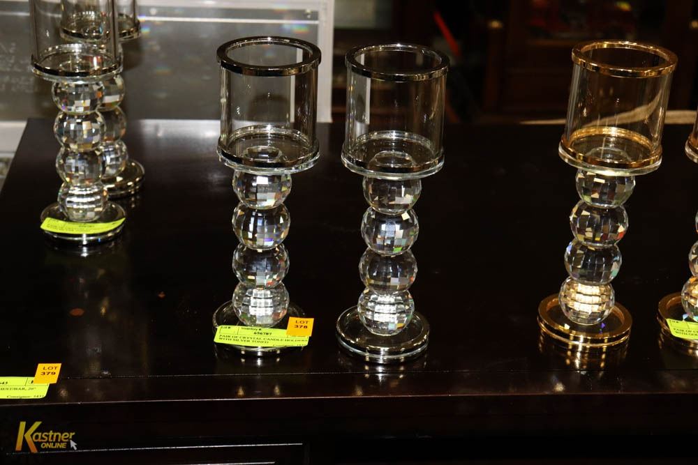 PAIR OF CRYSTAL CANDLE HOLDERS WITH SILVER TONED