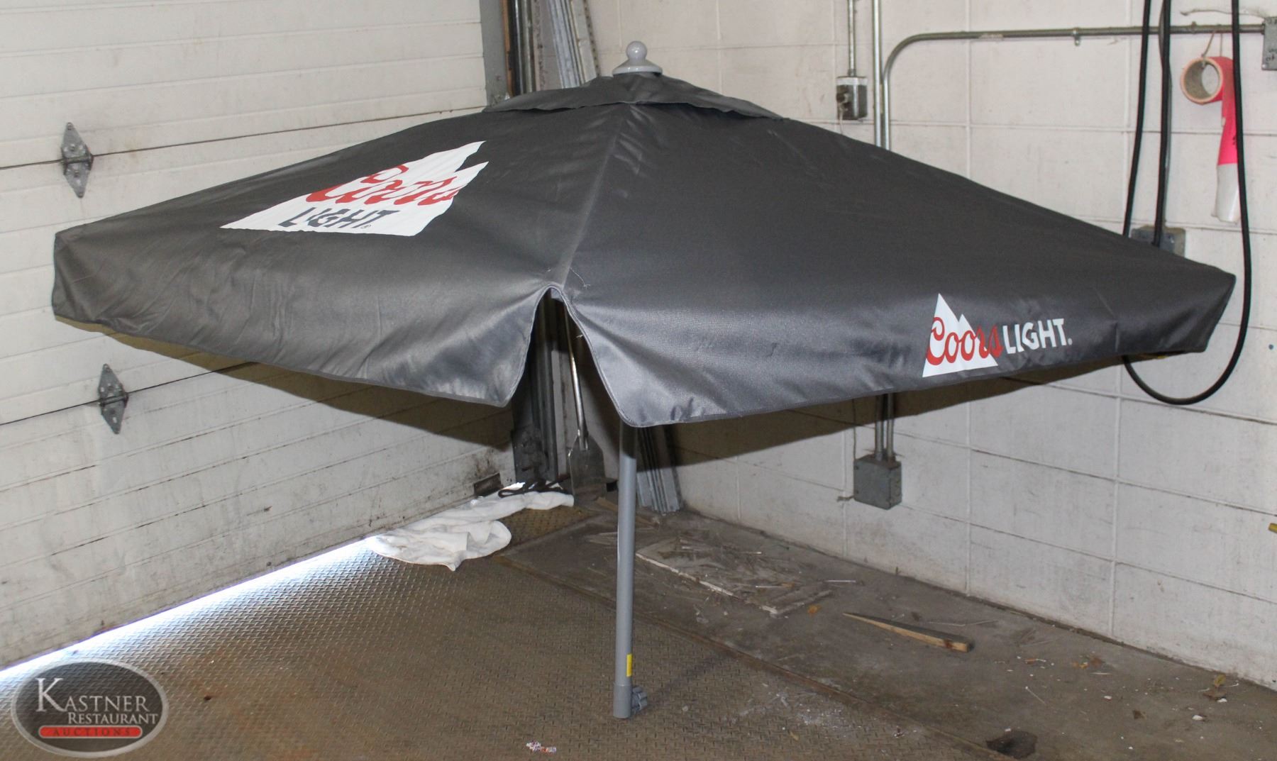 PAIR OF DARK GRAY COORS LIGHT PATIO UMBRELLAS