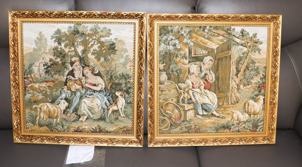 PAIR OF ESTATE GOLD FRAMED NEEDLE POINT PICTURES.