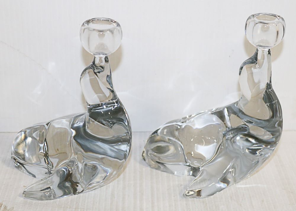 PAIR OF GLASS SEAL CANDLE HOLDERS