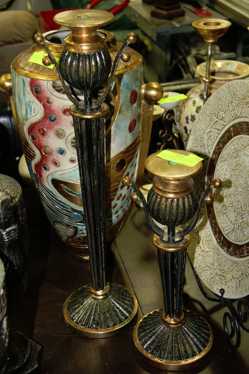 PAIR OF GREEN/CHARCOAL FINISH CANDLEHOLDERS