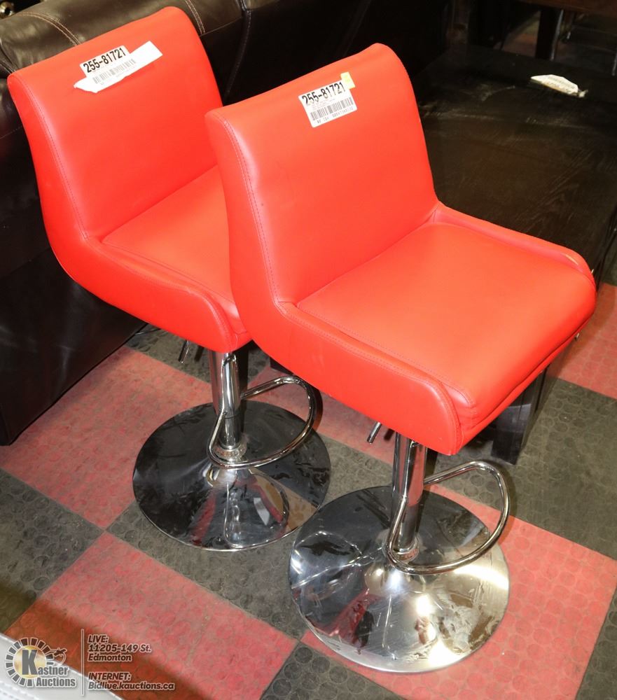 PAIR OF RED LEATHERETTE SWIVEL BAR STOOLS