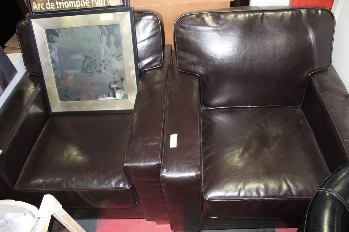 PAIR OF SHOWHOME BROWN LEATHERETTE SOFA