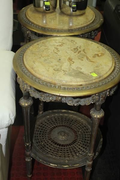 PAIR OF STONE TOP WOOD CARVED TABLES