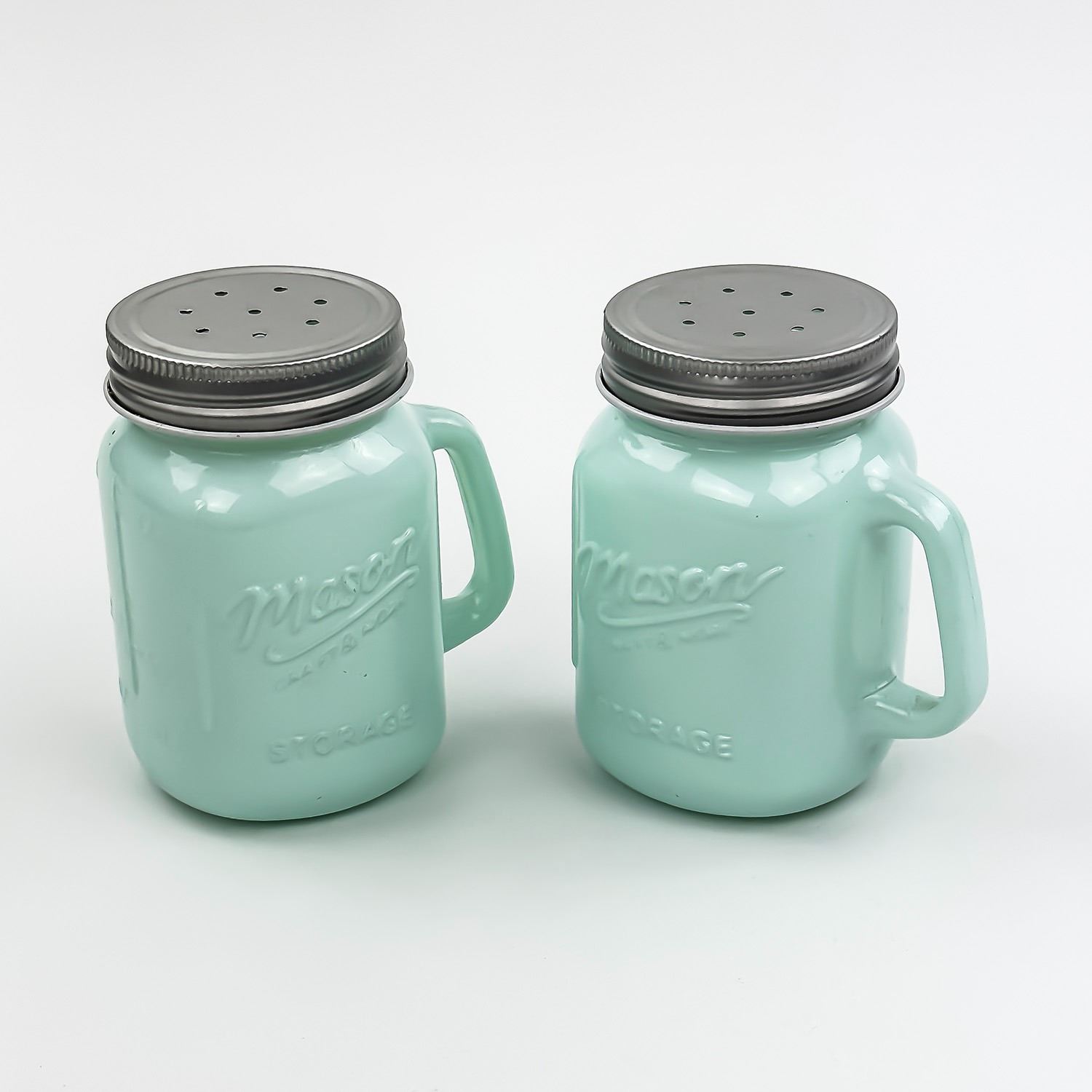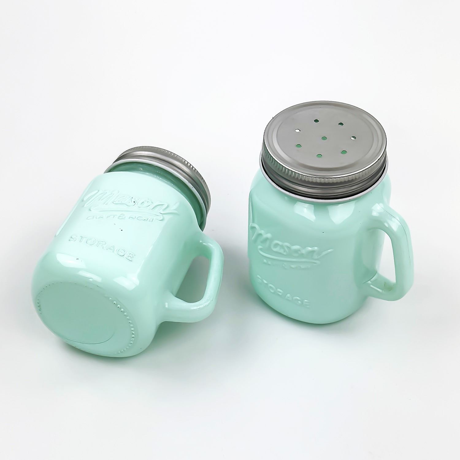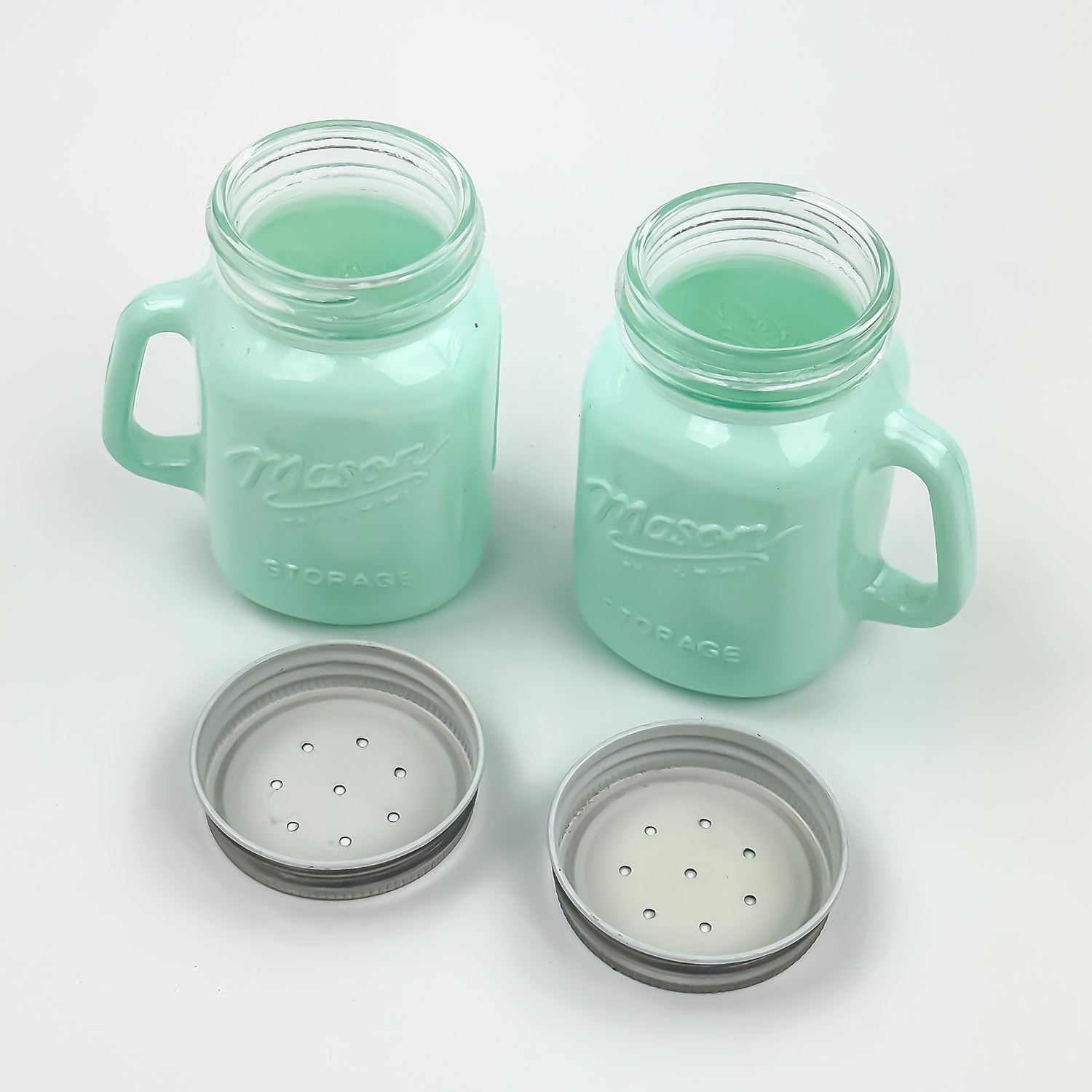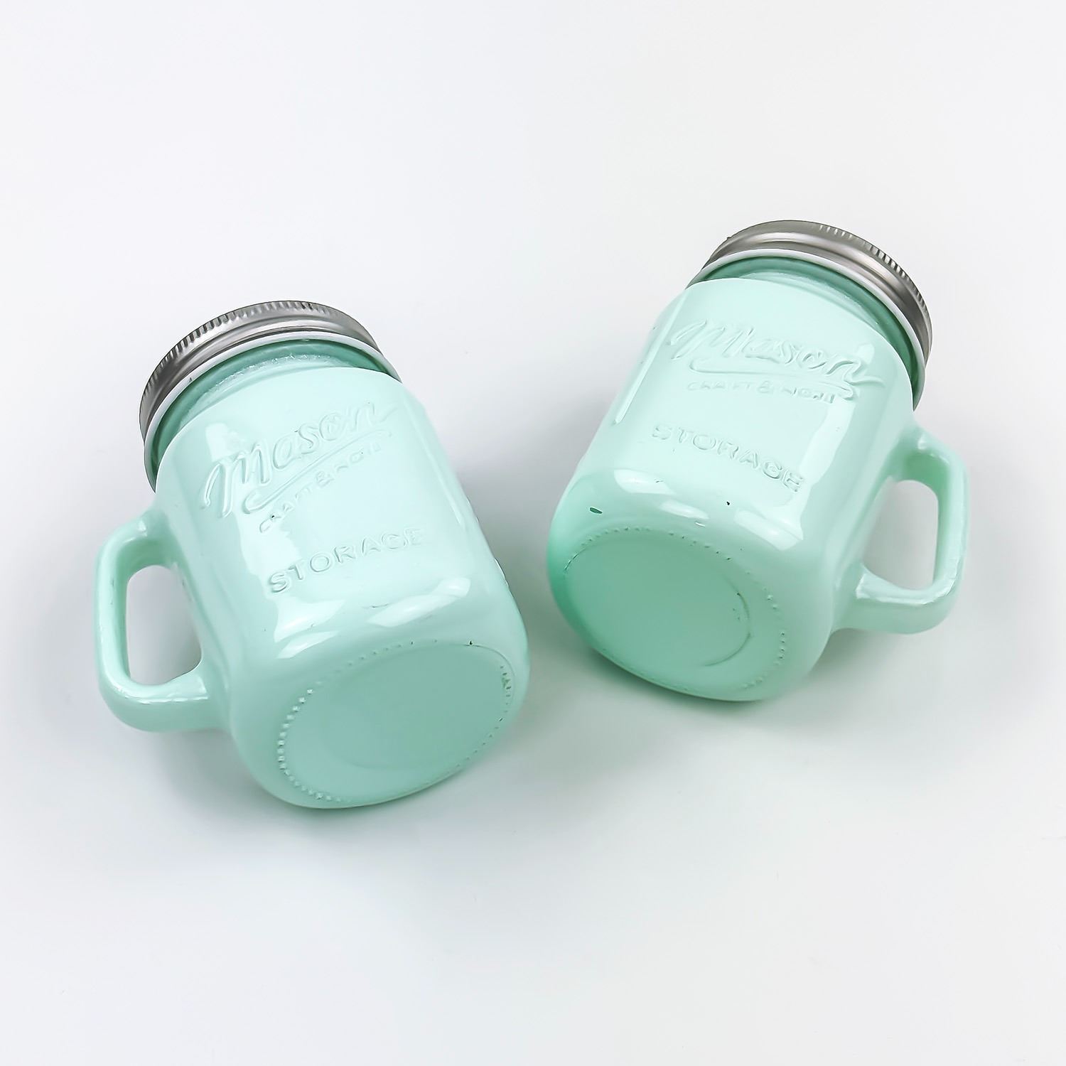 #8264 - MINIATURE GLASS MASON JARS WITH METAL LIDS. THEY MEASURE: 3.25” (8.5 CM) HIGH BY 2” (5 CM) SQUARE - EXCLUDING HANDLE